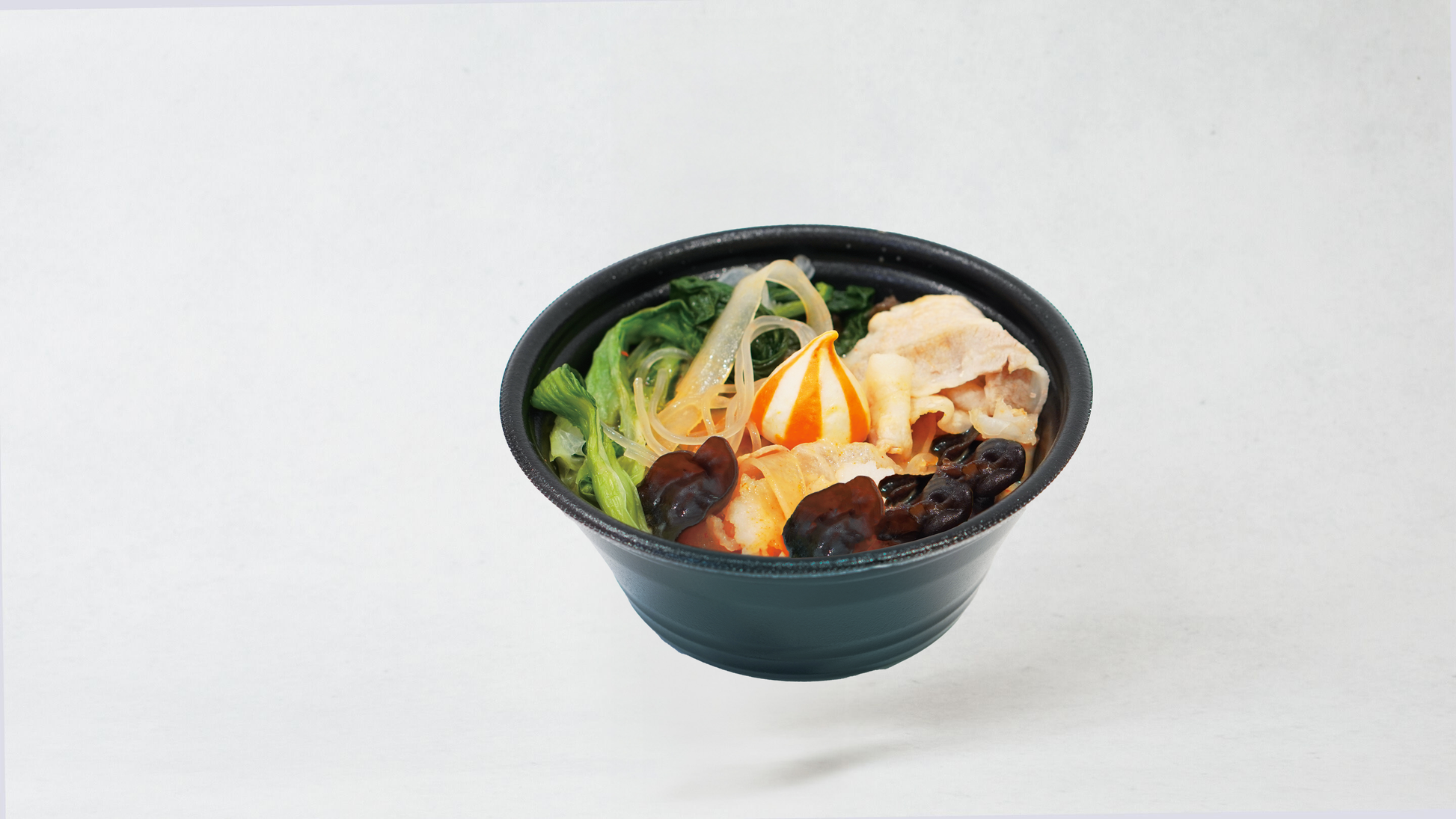 - 内容:豚しゃぶ、麻辣醤、豆乳、タンミョン、魚卵団子、黒きくらげ、チンゲンサイ、白菜